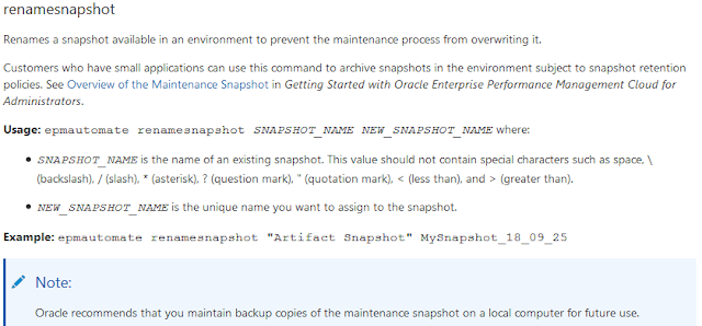 call epmautomate renamesnapshot “Artifact Snapshot” “~Backup %YYYY%-%MM%-%DD% 1:00am”